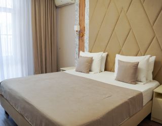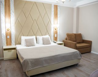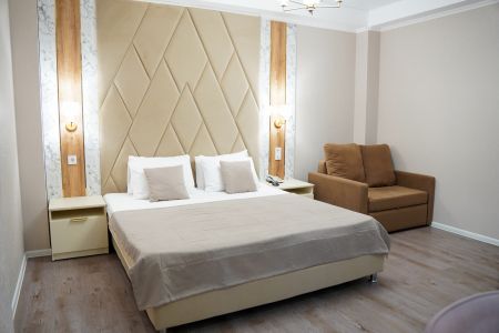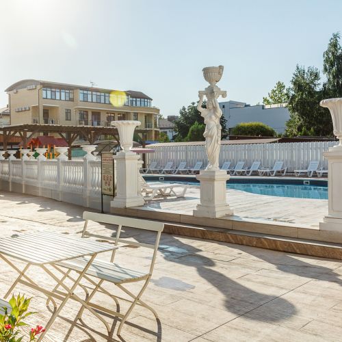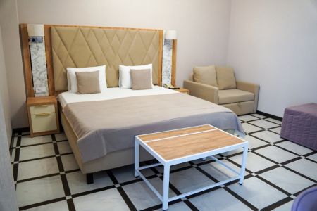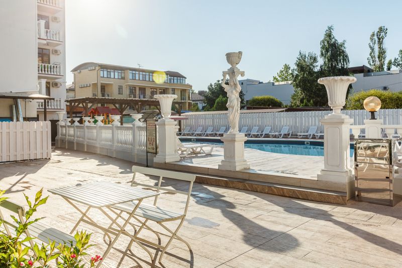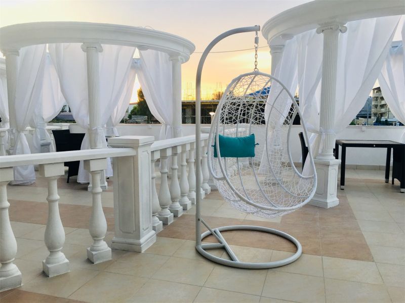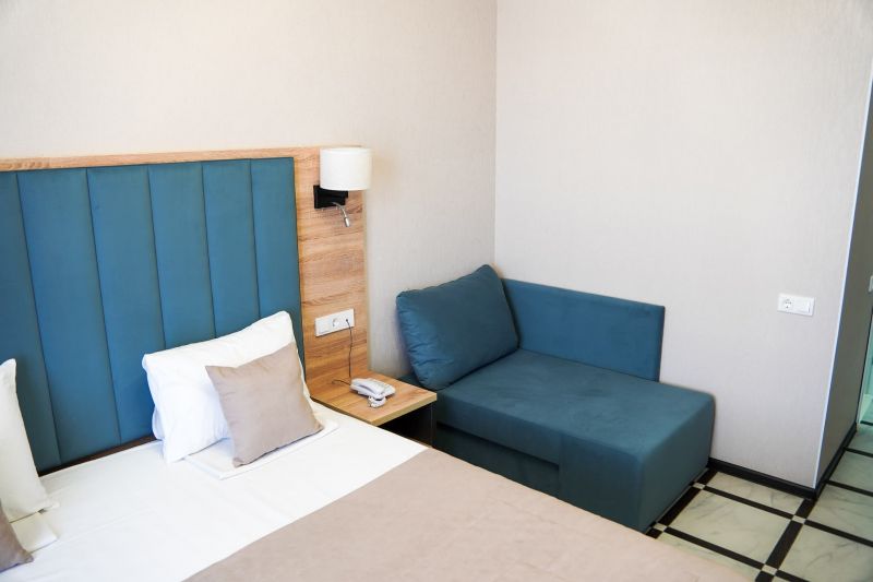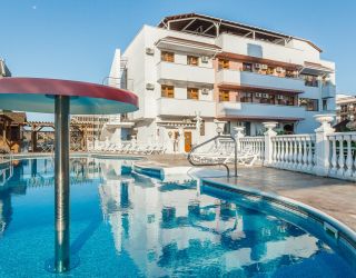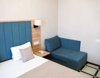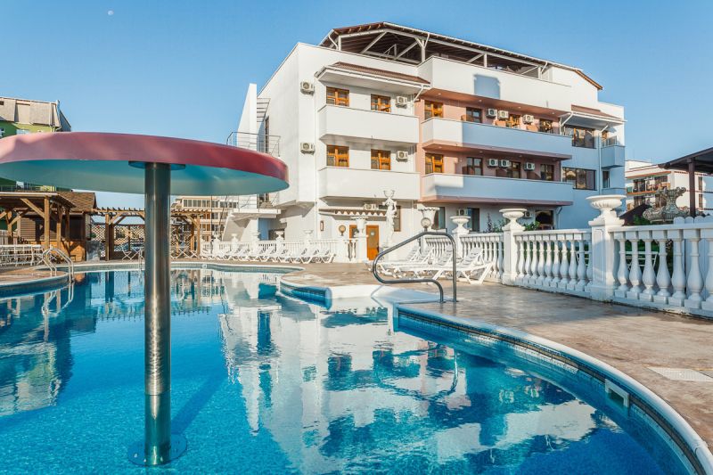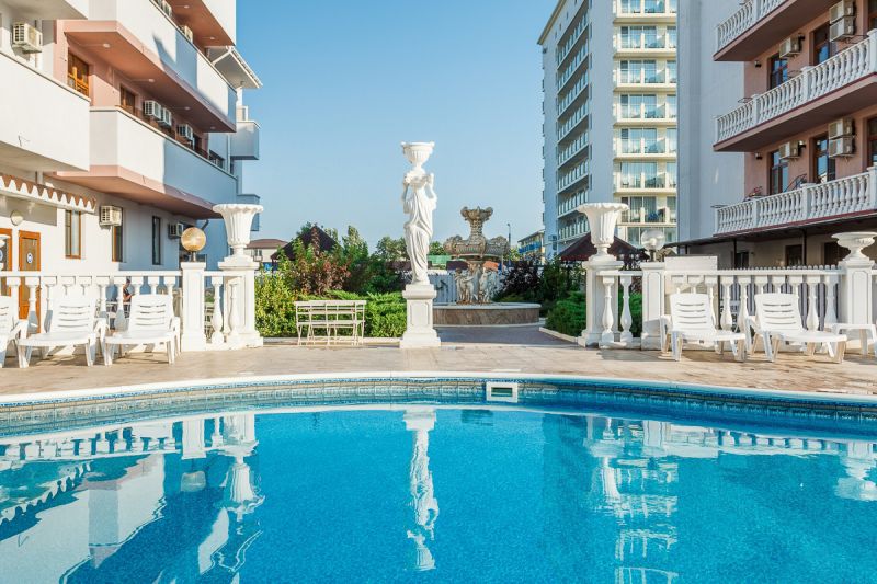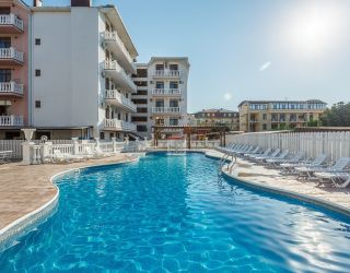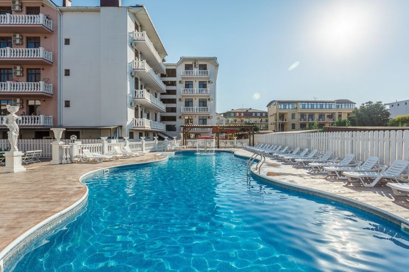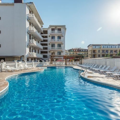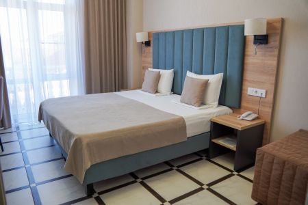Пятиэтажный корпус отеля с белоснежными балюстрадами балконов разместился всего в 300 метрах от морского побережья. К услугам гостей 60 стандартных номеров с приятными светлыми интерьерами и панорамными окнами. В каждом номере предусмотрен собственный санузел, есть кондиционер, телевизор-ЖК и небольшой холодильник.