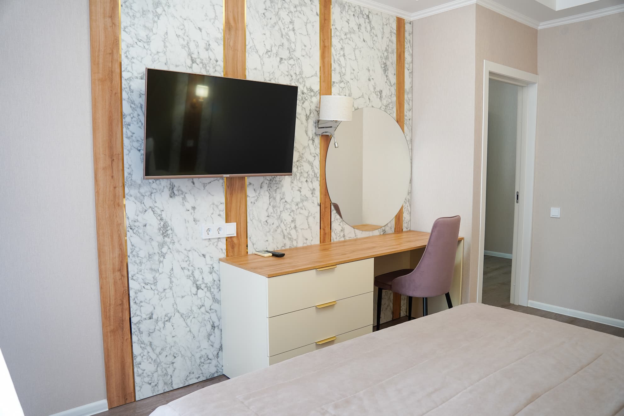 - Мебель: вешалка, диван, зеркало, кровати односпальные /одна двуспальная кровать, прикроватные тумбочки, стол, стулья, шкаф