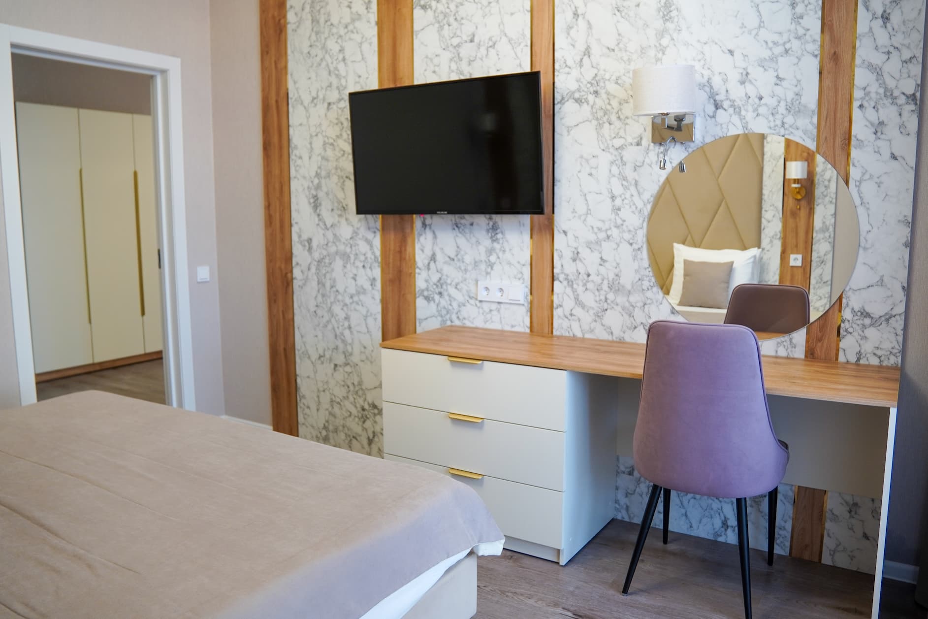 - Мебель: вешалка, зеркало, кресло-кровать, кровати односпальные /одна двуспальная кровать, прикроватные тумбочки, стол, стулья, шкаф